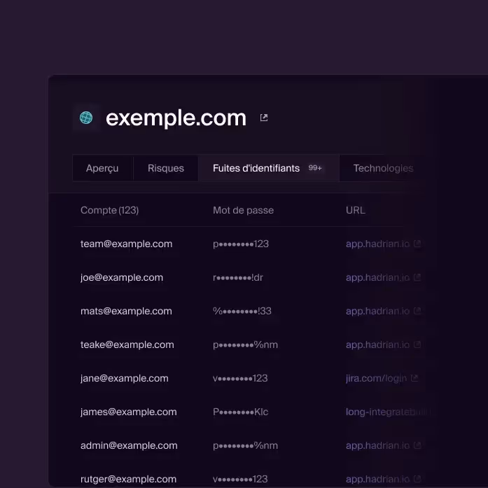 Les infections par des logiciels malveillants de type « infostealer » sont particulièrement dangereuses, car elles permettent de détourner des données sensibles et de les vendre au plus offrant sur le dark web. Hadrian surveille de manière éthique l'activité du dark web et peut détecter si les données de votre organisation font l'objet d'un commerce illégal.